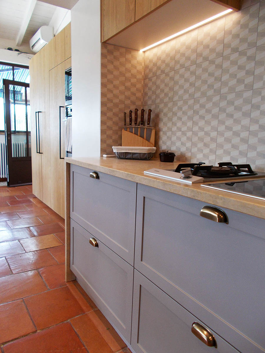 Façade menuisée en Chêne 3 plis massif finition « sciée » avec vitrificateur EXTREME extra MAT et MDF qualité EXTERIEUR laqué avec grands tiroirs et tiroirs à l’anglaise. Poignées coquilles à l’ancienne et plan de travail en pierre naturelle.